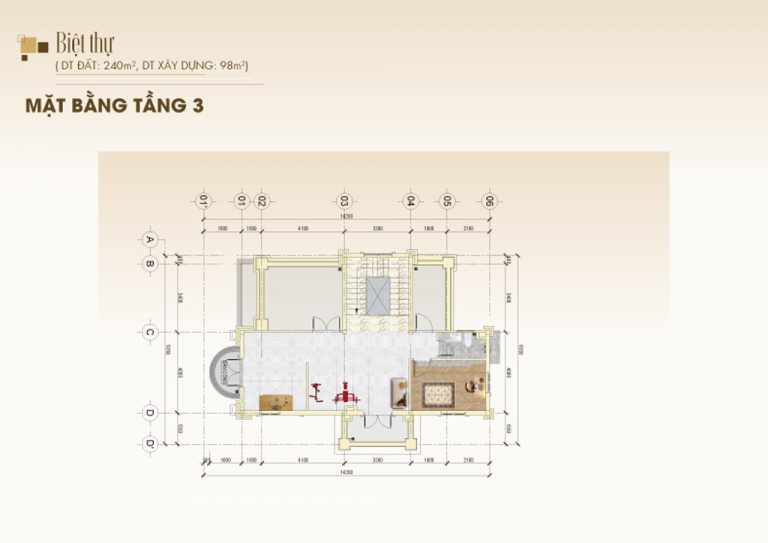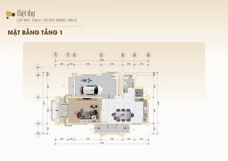 Mỗi căn biệt thự STC Long Thành có diện tích 240m2. Trong đó, diện tích xây dựng chỉ chiếm chưa đến 50% (98m2), phần còn lại là diện tích sân vườn.
