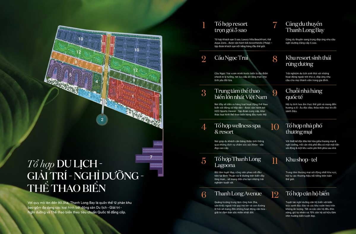 Dự án Thanh Long Bay có 90 hecta bao gồm 3 phân khu chính: Nhà phố – Biệt thự – Căn hộ biển 5 sao, kiến tạo không gian tràn đầy sức sống, gần gũi với thiên nhiên, mảng xanh của cây cỏ, mặt nước phủ khắp hầu hết mọi ngóc ngách của dự án.