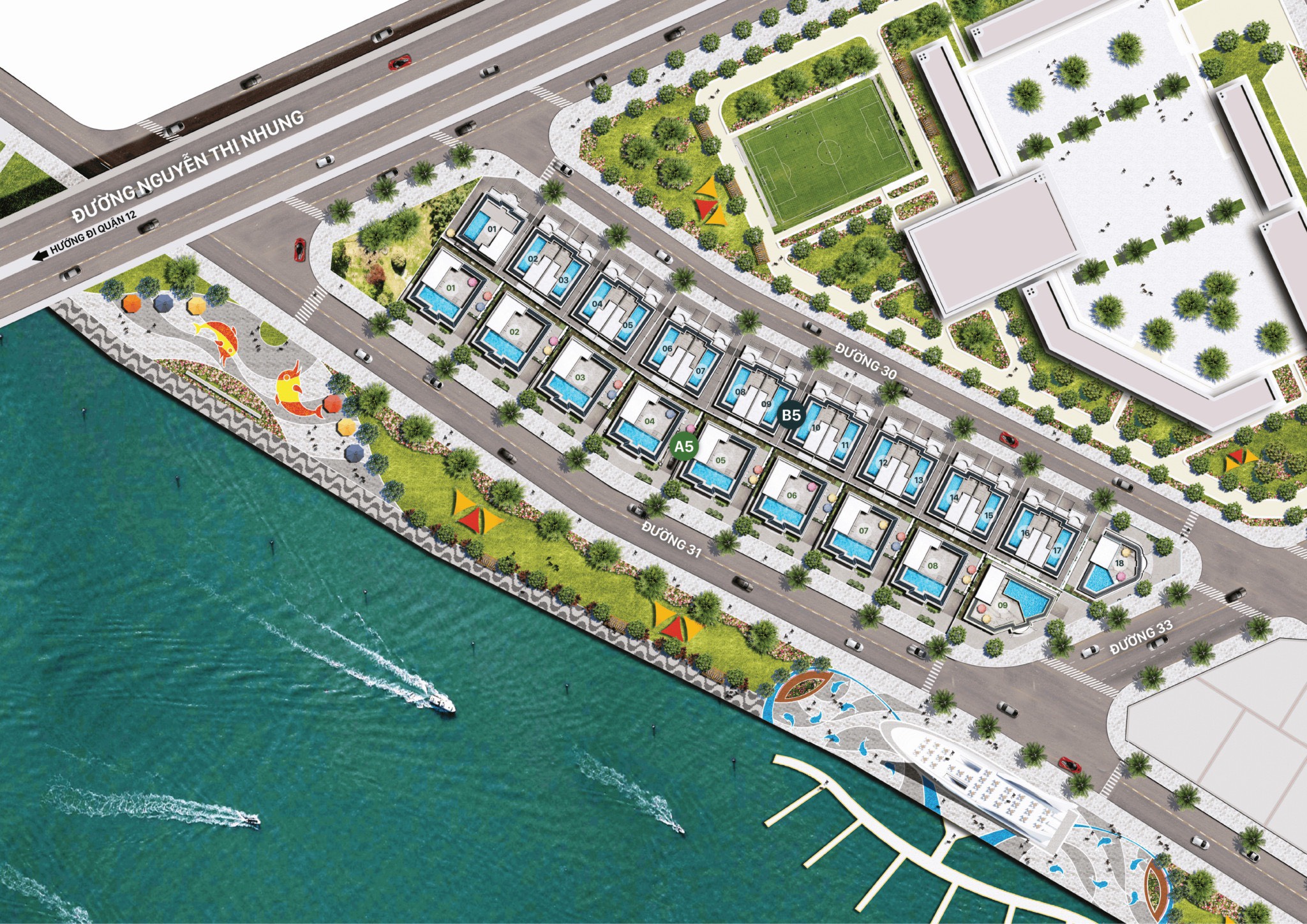 Bến du thuyền Dragon Bay phía trước & công viên ven sông đã hoàn thiện.