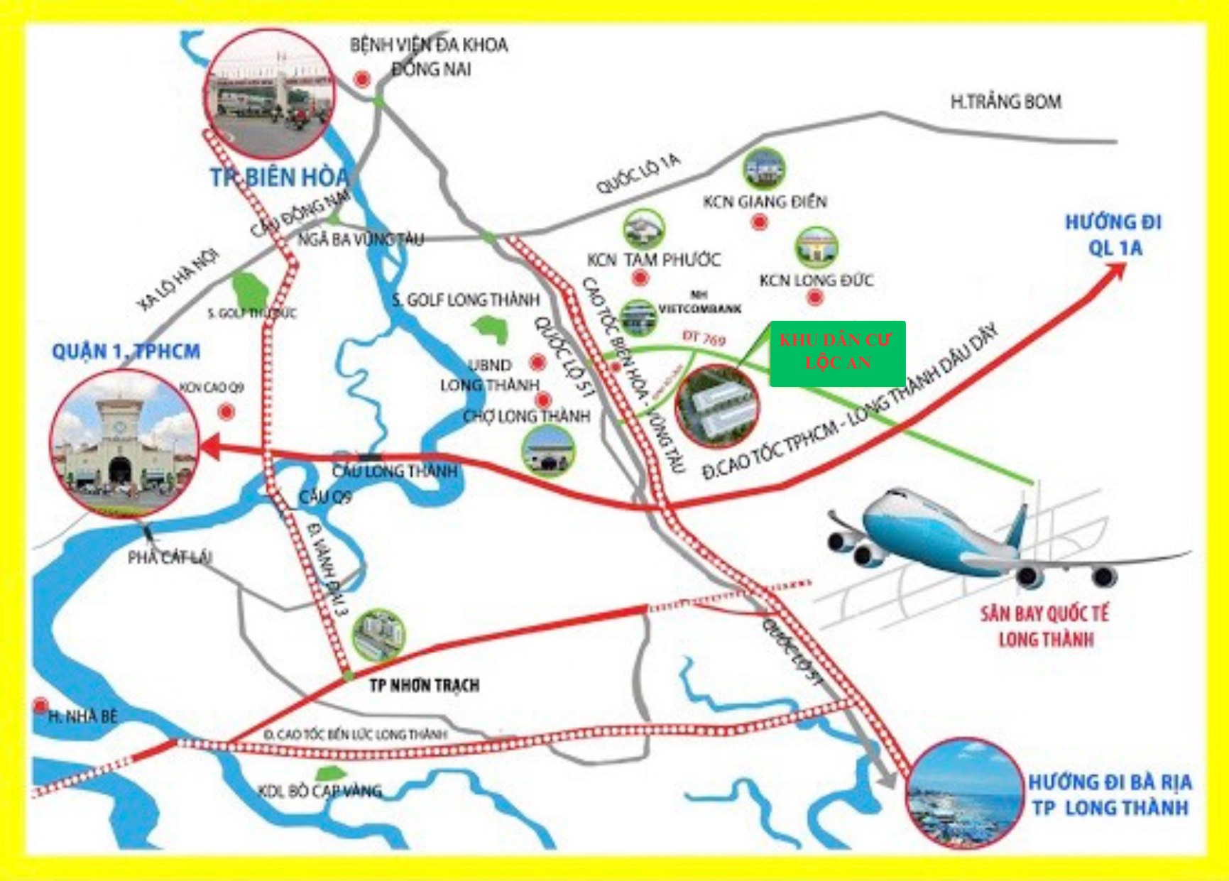 Từ Khu dân cư Lộc An – Long Thành, chỉ mất 2km là có thể tới Sân bay Quốc tế Long Thành. Khi dự án Sân bay Long Thanh hoàn thiện và đi vào hoạt động sẽ tạo ra cú hít lớn với nhu cầu về nhà ở tái định cư không ngừng tăng cao. Những dự án bất động sản xung quanh Sân bay Long Thành, trong đó có Khu dân cư Lộc An có thể đón đầu lợi thế và tiềm năng rất lớn từ sân bay.