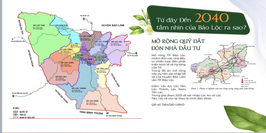 Mở rộng TP Bảo Lộc nhằm đón các nhà đầu tư chiến lược đến phát triển kinh tế và hạ tầng của TP. Trong đồ án mở rộng này ưu tiên sát nhập 06 xã của Huyện Bảo Lâm vào TP Bảo Lộc. Gồm: Lộc An, Lộc Tân, Lộc Thành, Lộc Nam, Tân Lạc. Trong giai đoạn 2025 sẽ sát nhập Lộc An và Lộc Tân, các xã còn lại theo lộ trình đến 2040.