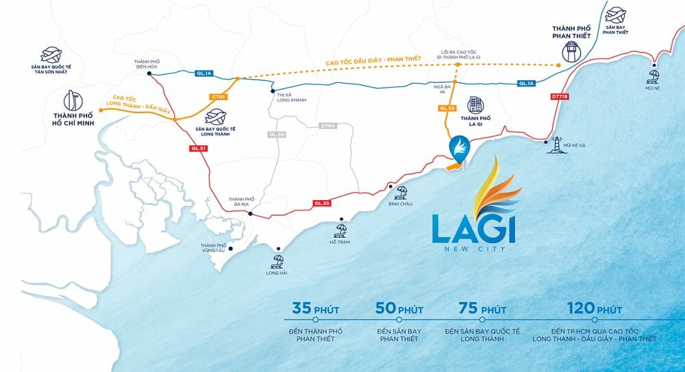 Ngoài ra, khu đô thị Lagi New City tọa lạc ngay cửa ngõ du lịch của tỉnh nhà, với tuyến quốc lộ 55 và tỉnh lộ 719 đi ngang. Đây đều là những tuyến đường huyết mạch nối các tỉnh thành của khu vực Đông Nam Bộ như: thành phố Hồ Chí Minh, sân bay Long Thành – Đồng Nai, Vũng Tàu, Phan Thiết.Cụ thể hơn, từ dự án Lagi New City chỉ cách thành phố Phan Thiết 54km, thành phố Hồ Chí Minh 155km, và cách thành phố Vũng tàu 88km. Và điểm đáng chú ý bởi, thị xã Lagi sở hữu 28km chiều dài đường bờ biển, với hai cửa biển lớn là sông Dinh và sông Phan. Do đó, với vị trí đắc địa mà dự án sở hữu, đã tạo nên được sự thuận lợi cho sự phát triển năng động, hội nhập với nền kinh tế trọng điểm phía Nam của Lagi New City.