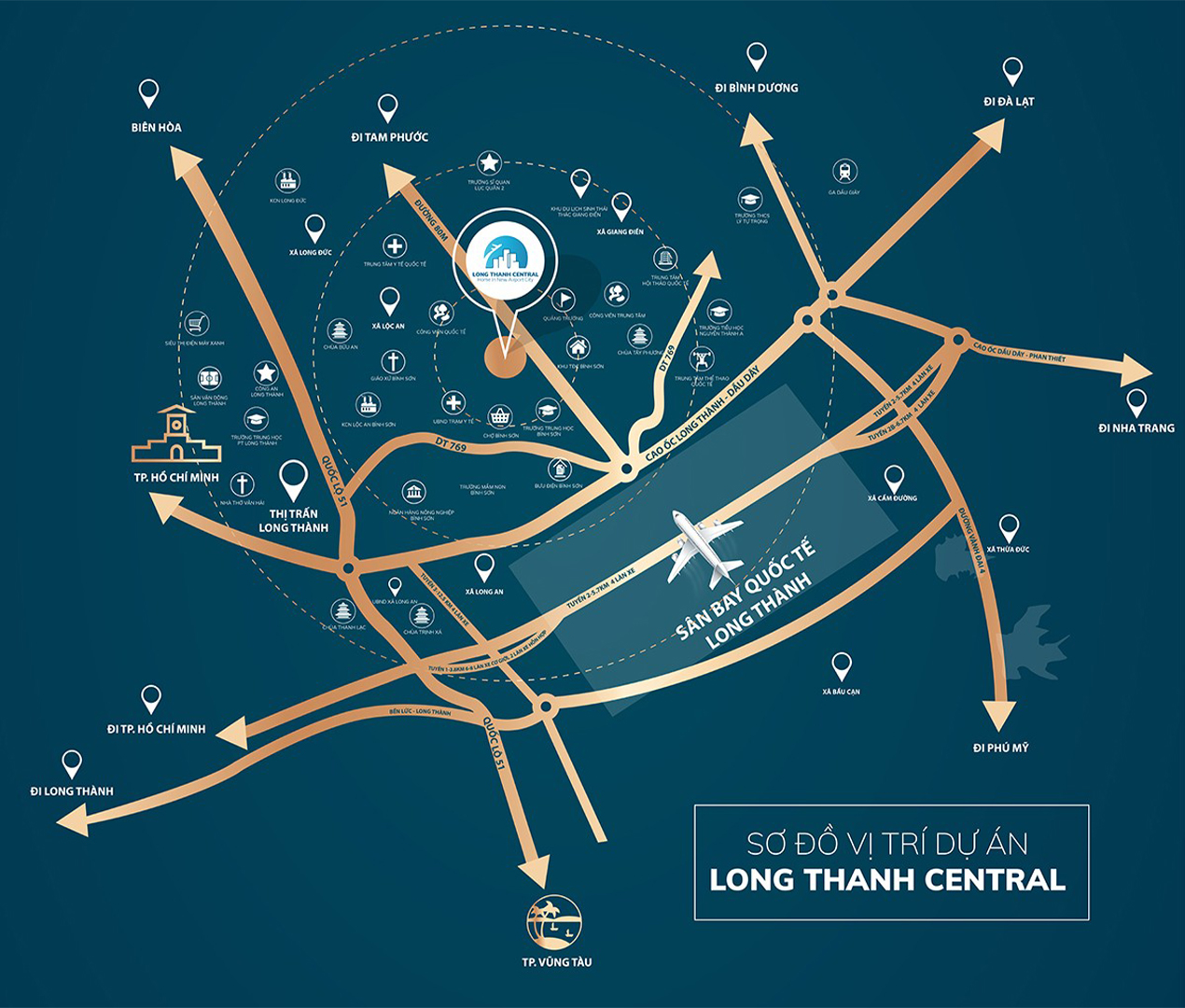 Từ vị trí Long Thành Central cư dân chỉ mất 10 phút di chuyển về sân bay Long Thành, trong tương lai khi sân bay Long Thành chính thức đưa vào hoạt động thì Long Thành Central sẽ là sự lựa chọn ưu tiên hàng đầu cho đối tượng khách hàng là cán bộ, công nhân viên làm việc tại sân bay Long Thành. Liền kề dự án là STC Long Thành, khu tái định cư Lộc An Bình Sơn và Các quỹ đất lợi thế đấu giá phát triển đô thị. Lợi thế dự án Long Thành Central kế cận nhau sẽ hỗ trợ rất tốt cho việc tập trung dân cư và hình thành các tiện ích đi kèm như thương mại, giáo dục, y tế…Khu vực Long Thành vẫn đang có sức hút rất tốt đối với thị trường bất động sản khi sân bay Long Thành chính thức khởi công từ 2021 và dự kiến bắt đầu đi vào hoạt động từ 2025. Ngoài ra khu vực Long Thành nói riêng hay Đồng Nai nói chung vẫn đang được chú trọng đặc biệt để phát triển cơ sở hạ tầng. Các công trình trọng điểm đã và đang triển khai xây dựng như Cao tốc Biên Hòa - Vũng Tàu, Cao tốc Dầu - Giây Phan Thiết, Cao tốc Dầu Giây - Liên Khương, Cao tốc Bến Lức - Long Thành…Là nơi giao thoa của các tuyến cao tốc chiến lược của vùng đông nam bộ, trong tương lai huyện Long Thành sẽ là điểm đến lý tưởng của các doanh nghiệp trong và ngoài nước, nhờ đó cũng thu hút được lượng lớn lao động, dân cư. Giá cả bất động sản cũng tăng trưởng bền vững song song với sự hoàn thiện của cơ sở hạ tầng.