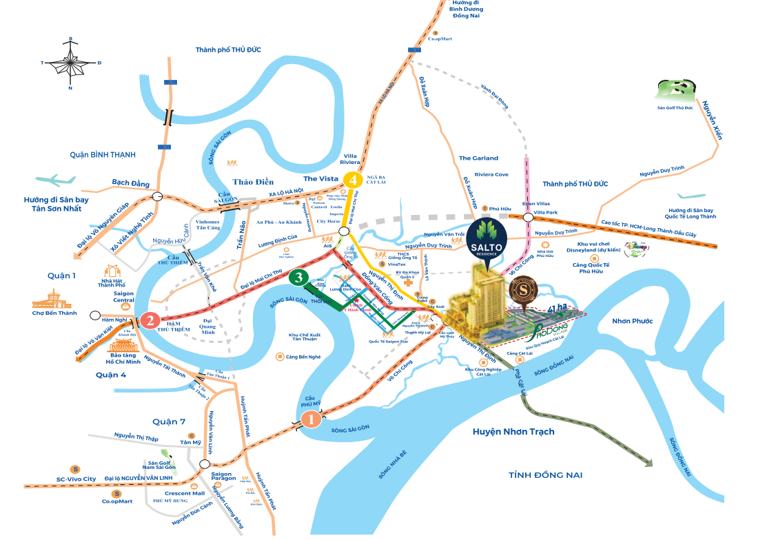 - Cư dân tại Salto Residence có thể kết nối nhanh chóng với các tỉnh phía Đông Nam Bộ và trung tâm hành chính mới Thủ Thiêm.