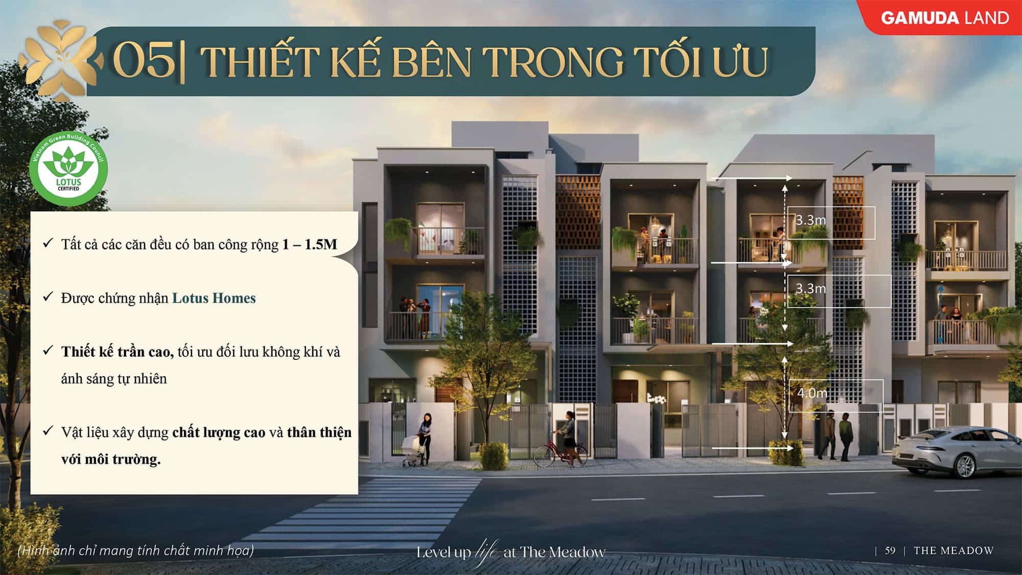 The Meadow mang đến cho khách hàng những căn nhà phố được thiết kế theo phong cách hiện đại, sang trọng nhưng vẫn giữ được nét truyền thống tinh tế. Gamuda Land đã hợp tác với các kiến trúc sư hàng đầu để tạo nên những không gian sống vừa tiện nghi, vừa ấm cúng, phù hợp với văn hóa và phong tục tập quán của người Việt Nam.