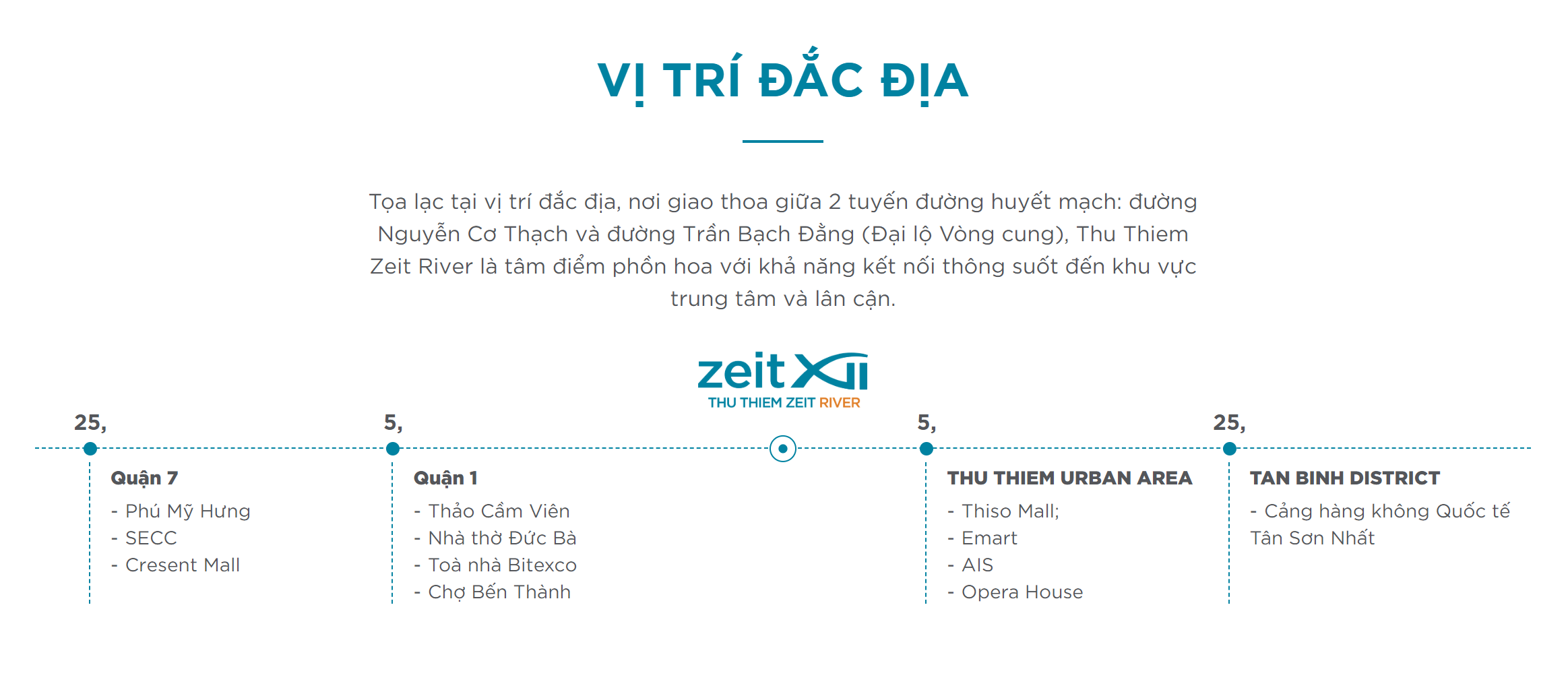 Tọa lạc đắt giá ngay trung tâm khu đô thị mới, kết nối dễ dàng đến Quận 1 chỉ với 5 phút di chuyển qua cầu Thủ Thiêm, Thu Thiem Zeit River thừa hưởng trọn vẹn hệ sinh thái tiện ích ngoại khu hiện đại: Trung tâm hành chính – kinh tế – văn hóa, trường học quốc tế, bệnh viện quốc tế, trung tâm thương mại và các dịch vụ vui chơi giải trí… sầm uất bậc nhất.