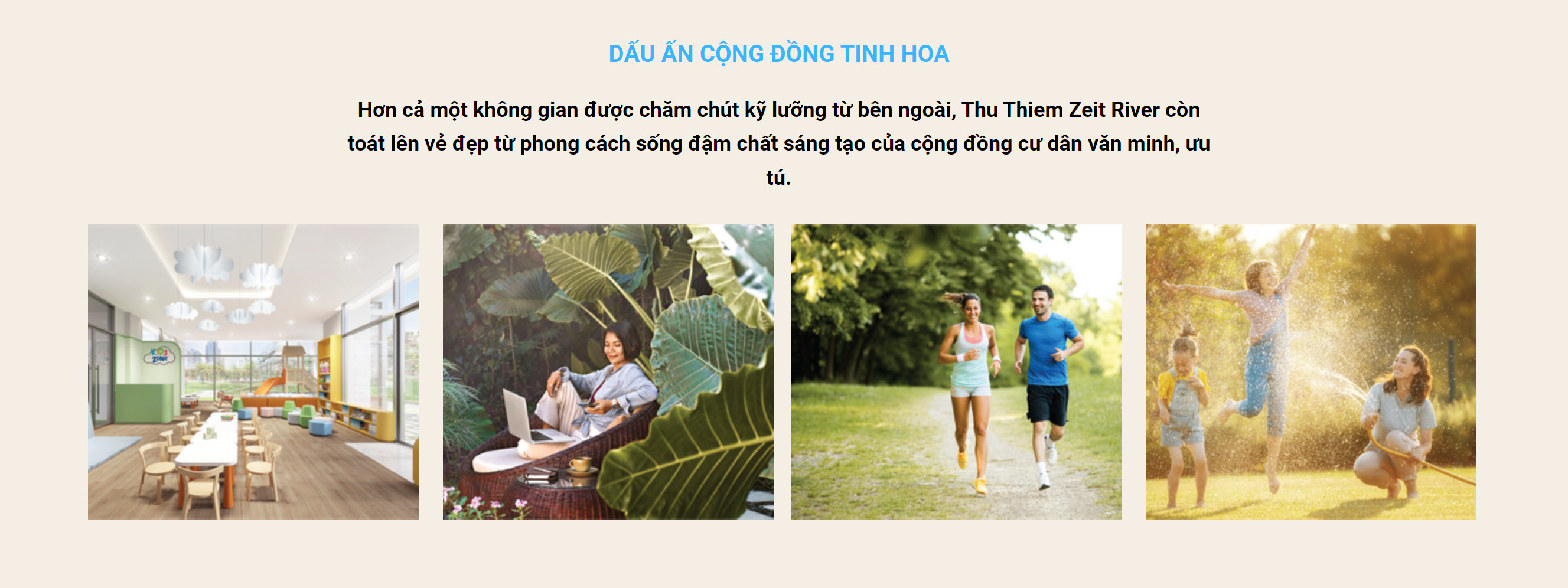 Các căn hộ cao cấp, biệt thự, penhouse được thiết kế tinh tế, ban công rộng lớn, nội thất chuẩn hạng sang nhằm mang đến cho chủ nhân không gian sống đậm chất đương đại, thoáng đãng, cùng tầm nhìn bao quát thành phố. Hành lang dự án được phủ xanh, rợp bóng cây với đài phun nước, khu hồ bơi bơi và nhà hàng rooftop sang trọng tại lầu 5 – nơi lý tưởng để thư giãn. Thủ Thiêm Zeit River quận 2 xứng đáng trở thành “chốn đi về” bình yên, mở ra một thế giới riêng tư và đẳng cấp giữa trung tâm đô thị năng động.